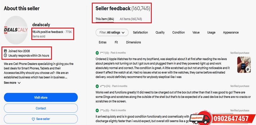 Ví dụ: ngưới bán này có mức đánh giá tốt 98.4%, tham gia bán hàng trên eBay khá lâu từ tháng 11-2008 và bán được 773k sản phẩm.