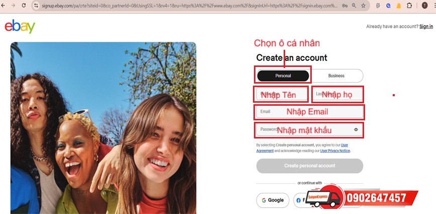 Tạo tài khoản eBay. Bạn truy cập vào trang web ebay.com và đăng ký tài khoản cá nhân.